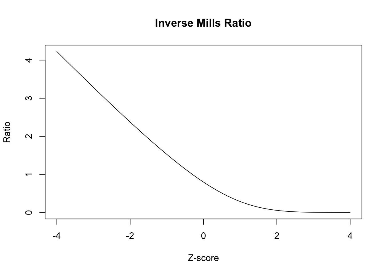 Let’s look at the conditional expectation of \(y_{i1} \mid z_i\) given \(z_i < 0\). We know the conditional expectation of \(y_{i1} \mid z_i = z\): \[ x_i^T \beta + \rho \sigma (z_i - x_i^T \gamma^\prime) \] What is the conditional expectation of \(z \mid z < 0\)? This is called the inverse Mills ratio: \[ \Exp{z \mid z < 0} = x_i^T \gamma^\prime - \frac{\phi(-x_i^T \gamma^\prime)}{\Phi(-x_i^T \gamma^\prime)} \] Plugging this in above gives: \[ x_i^T \beta - \rho \sigma \frac{\phi(-x_i^T \gamma^\prime)}{\Phi(-x_i^T \gamma^\prime)} \]