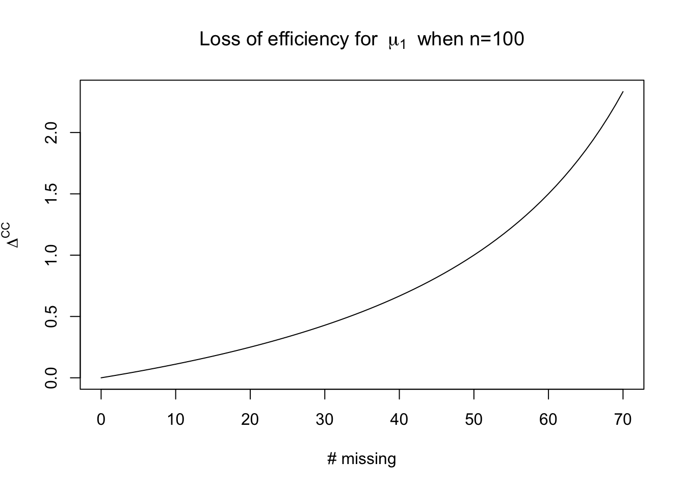 For the mean of \(Y_{i2}\), \(\mu_2\), the efficiency loss is: \[ \Delta^{\mathrm{CC}} \approx \frac{(n-r)\rho^2}{n(1 - \rho^2) + r \rho^2} \] We’ll prove this later in the class when we work through likelihood theory for incomplete data.