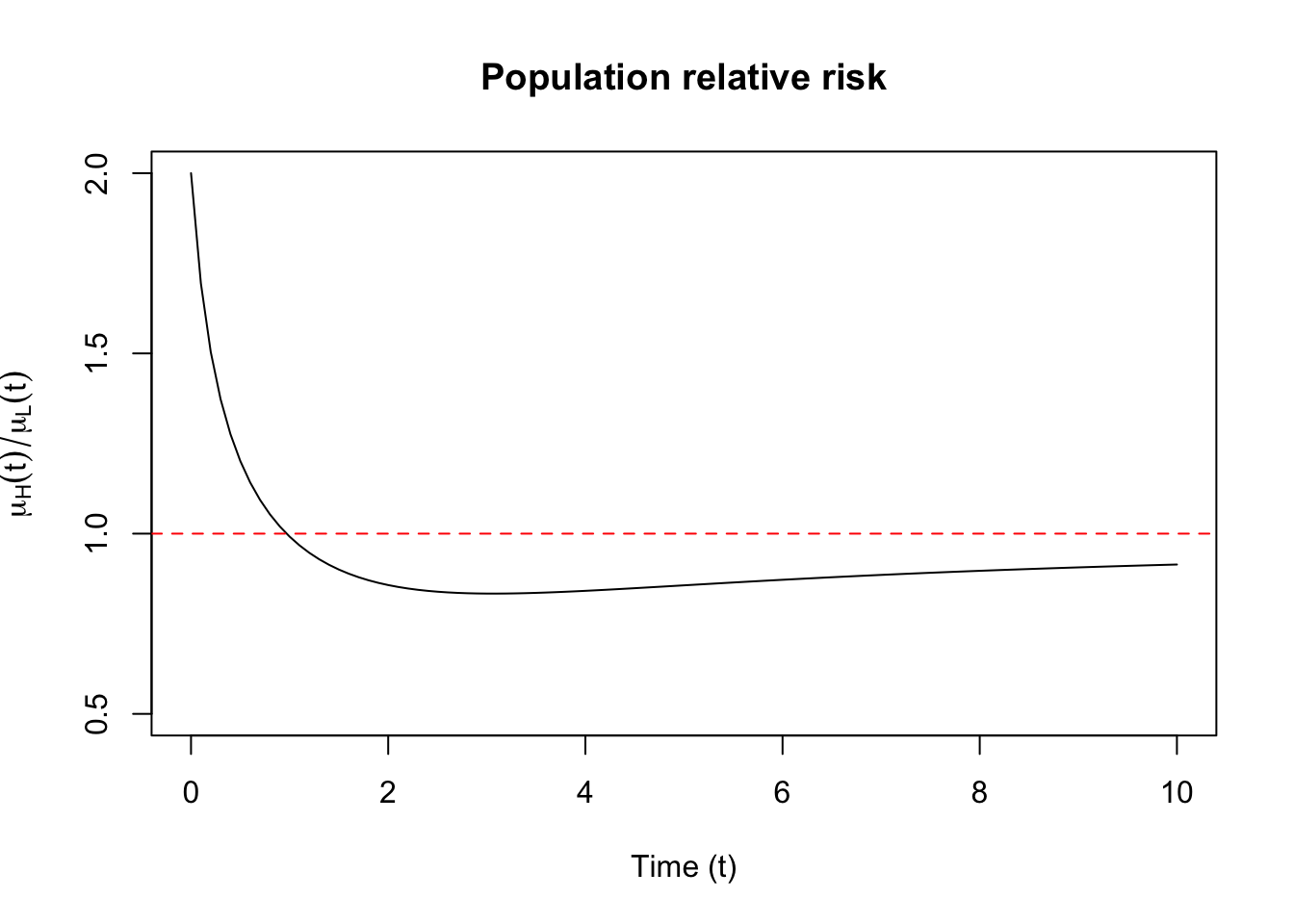 Suppose instead that the high-risk group is such that some exposure imparts has increased this group’s relative risk compared to a baseline hazard at small times but this relative risk declines to \(1\) as time increases. The function \(r(t) = 1 + e^{-t}\) satisfies this basic trajectory. If we assume that the low-risk group has a constant individual level hazard the individual hazard rates are written: \[\begin{align*} \lambda_{iH}(t) & = \upxi_{iH} (1 + e^{-t}) \\ \lambda_{iL}(t) & = \upxi_{iL} \end{align*}\] The cumulative hazard rates are: \[\begin{align*} \Lambda_{iH}(t) & = \upxi_{iH} (t + 1 - e^{-t}) \\ \Lambda_{iL}(t) & = \upxi_{iL} t \end{align*}\] This results in a population relative risk as: \[\begin{align*} \frac{\mu_H(t)}{\mu_L(t)} & = (1 + e^{-t})\frac{1 + \nu t}{1 + \nu t + \nu (1 - e^{-t})} \end{align*}\] The odd thing is that the population relative risk starts at \(2\) and declines to below \(1\) as time increases, as can be seen in Figure 1). This results in a paradox, namely that individual relative risk is always greater than \(1\) but that population relative risk does not adhere to this relationship.
