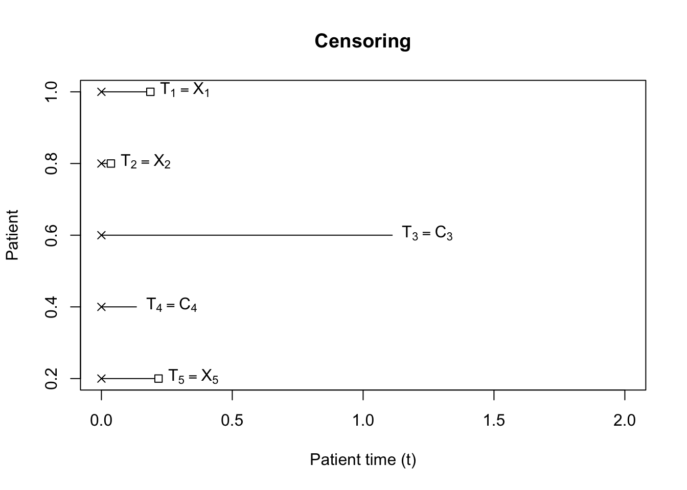 Let \(T_i = \min(X_i, C_i)\). This implies that the event \(\{T_i \geq t\} \equiv \{C_i \geq t, X_i \geq t\}\).