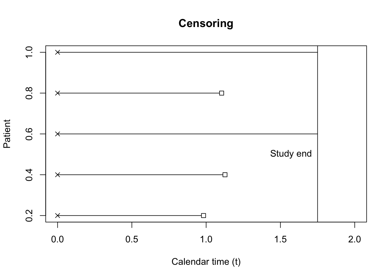 The simplest censoring scenario is one in which all individuals have the same, nonrandom censoring time. Imagine a study is designed to follow \(5\) startups that are spun out of a tech incubator to study how long it takes a company to land its first contract. This information will be used for designing investments \(2\) years from the study date, so the study has a length of \(1.75\) years. We can say that all observations will have to have occurred, or not, by \(1.75\) years.